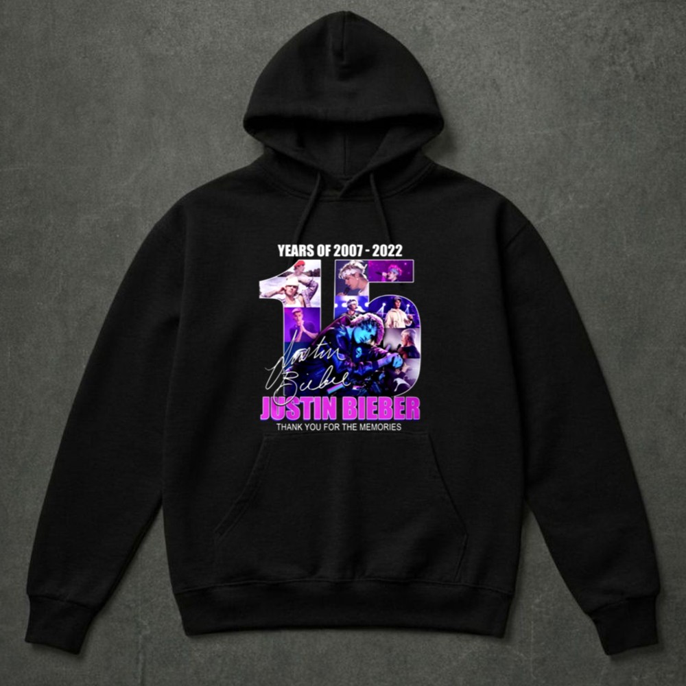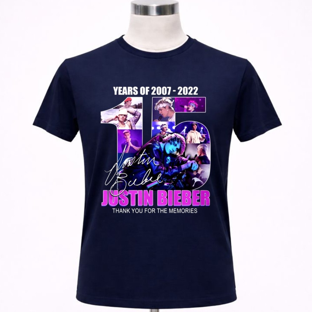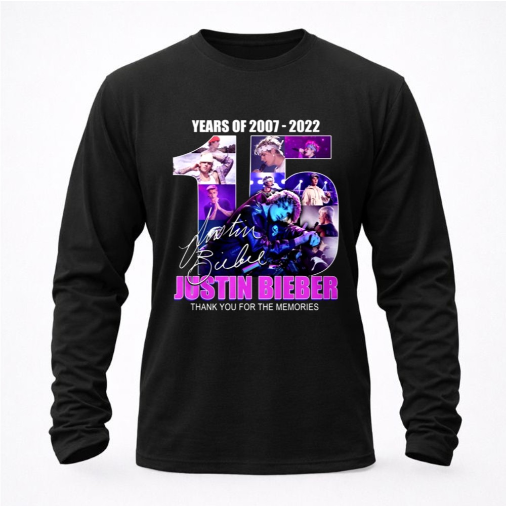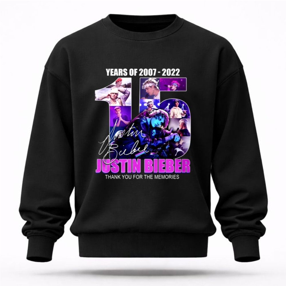 This design encapsulates the essence of Justin Bieber’s remarkable journey over 15 years, blending vibrant graphics with his iconic signature. The message ‘THANK YOU FOR THE MEMORIES’ resonates deeply with fans, inviting them to reflect on the joy and nostalgia his music has brought into their lives. It serves as a heartfelt celebration of his impact on pop culture.