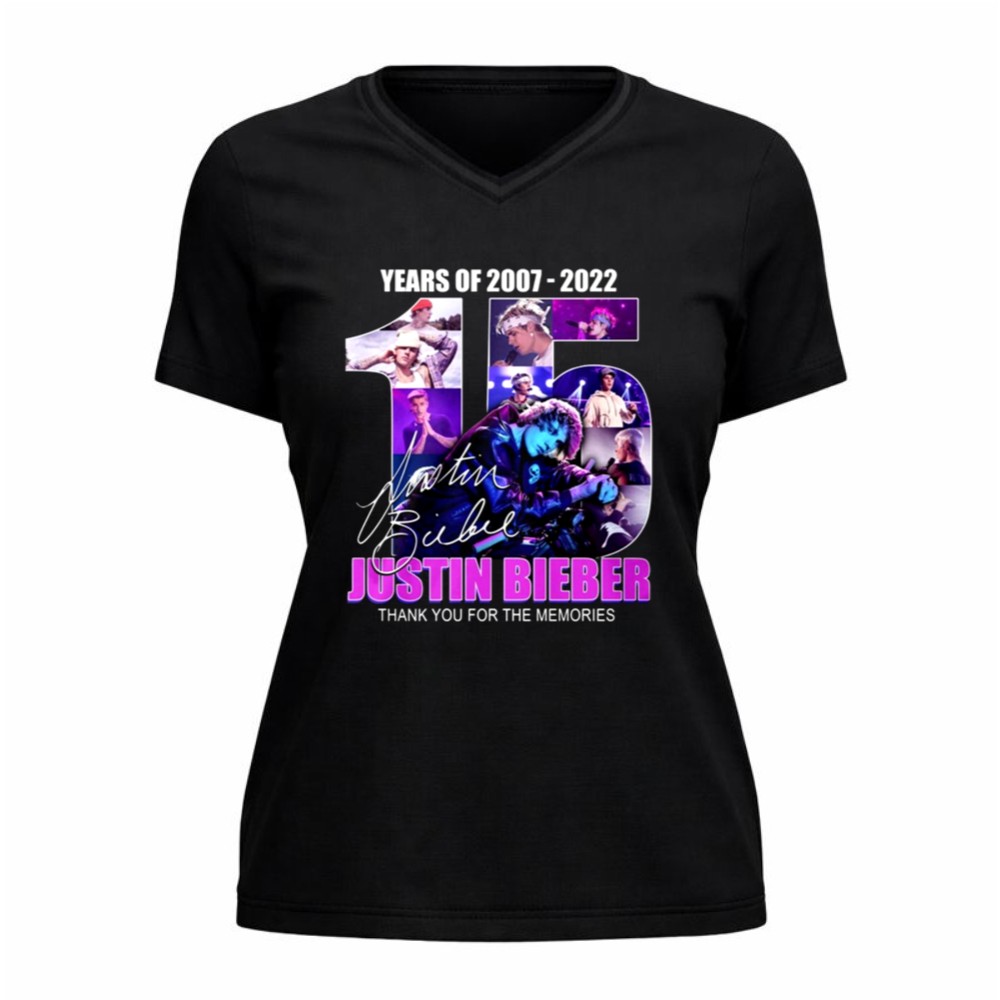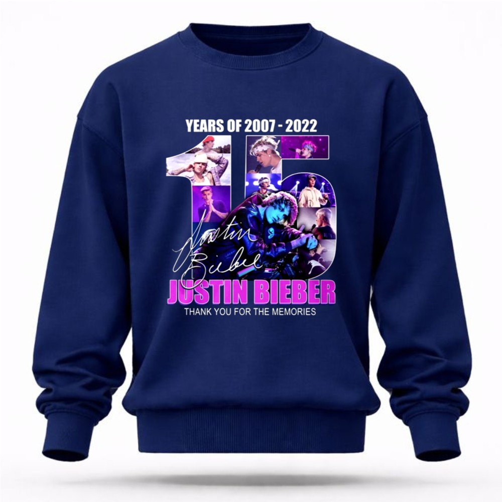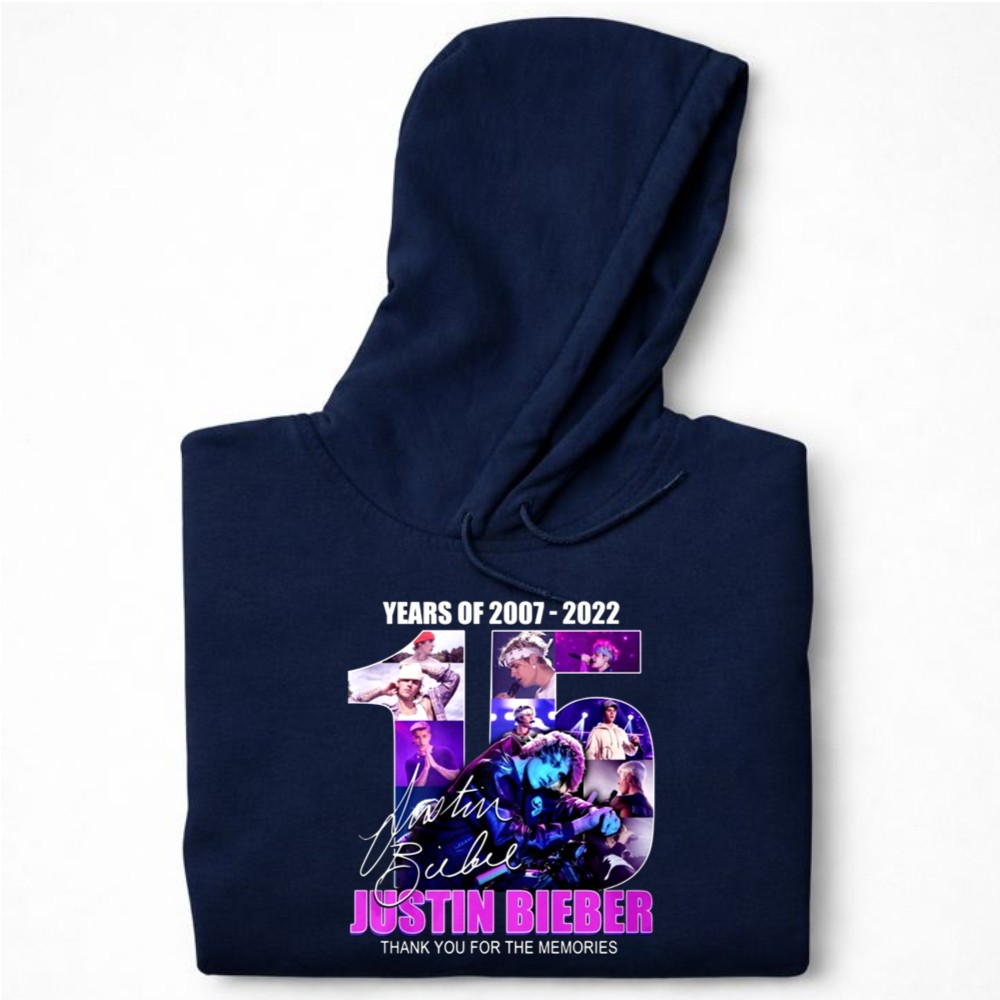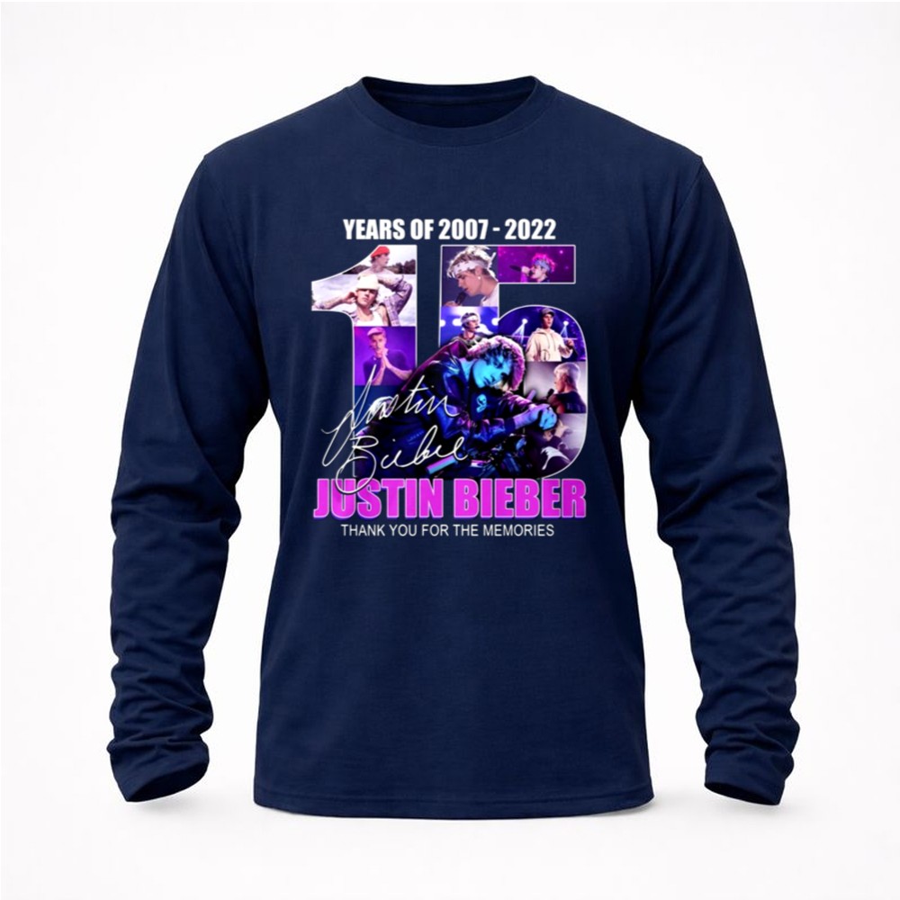 This design encapsulates the essence of Justin Bieber’s remarkable journey over 15 years, blending vibrant graphics with his iconic signature. The message ‘THANK YOU FOR THE MEMORIES’ resonates deeply with fans, inviting them to reflect on the joy and nostalgia his music has brought into their lives. It serves as a heartfelt celebration of his impact on pop culture.