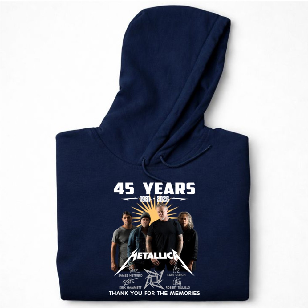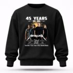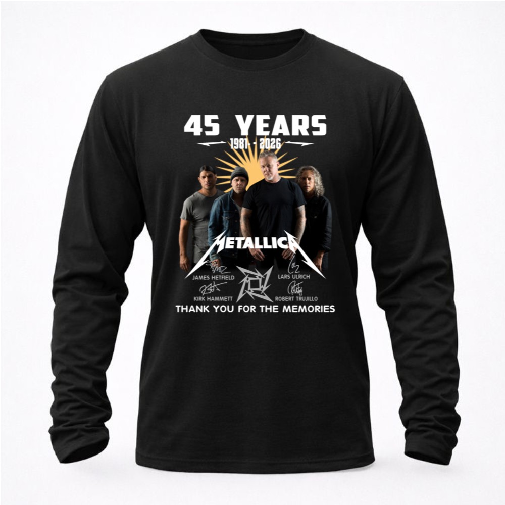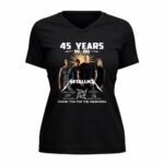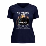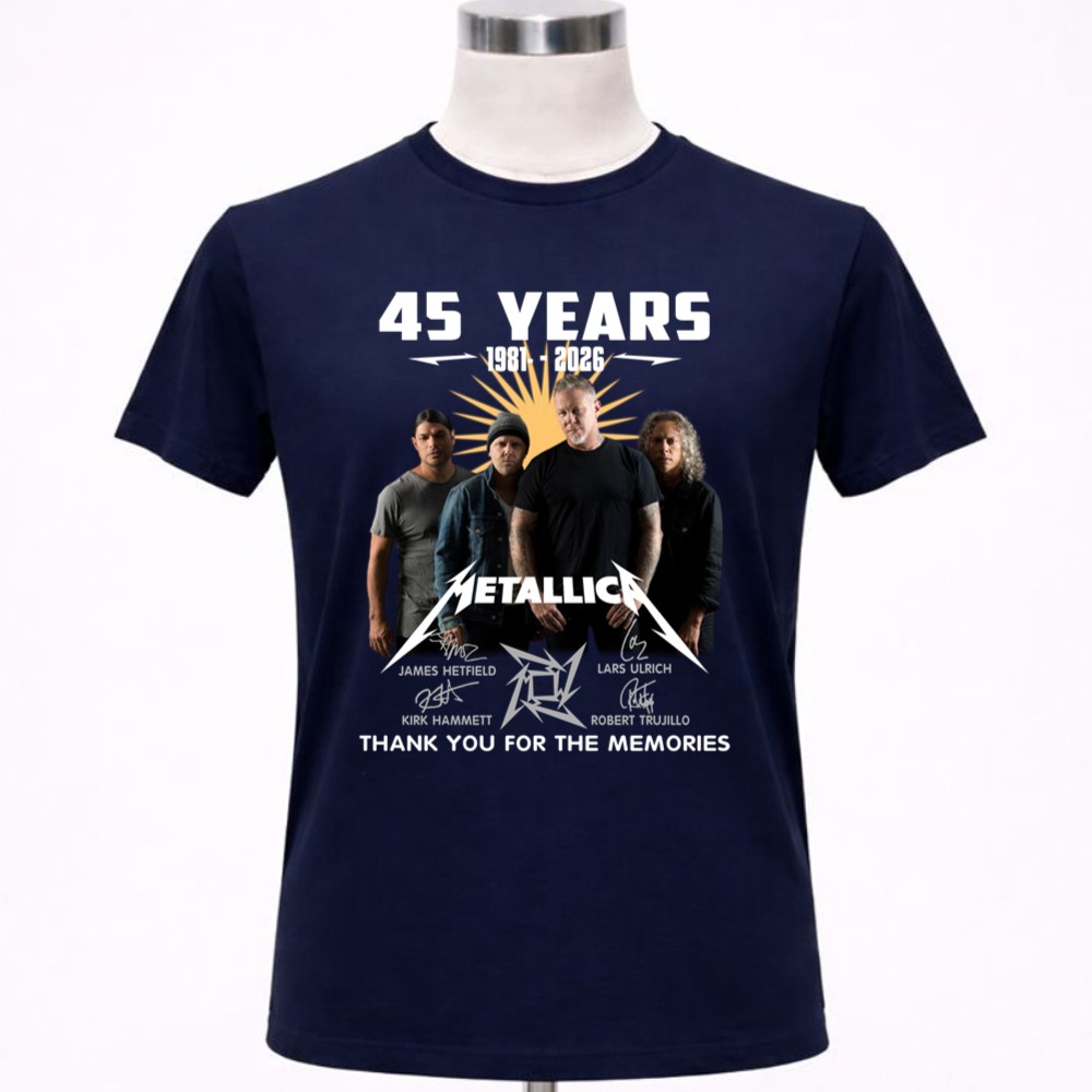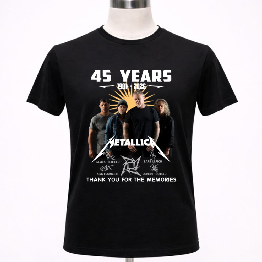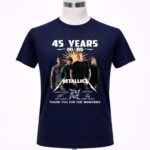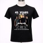 Metallica anniversary shirt, 45 years of metal, rock legends memorabilia, heavy metal music apparel, iconic band signatures, tribute to Metallica, concert-ready t-shirt, thank you for the memories