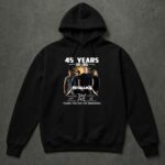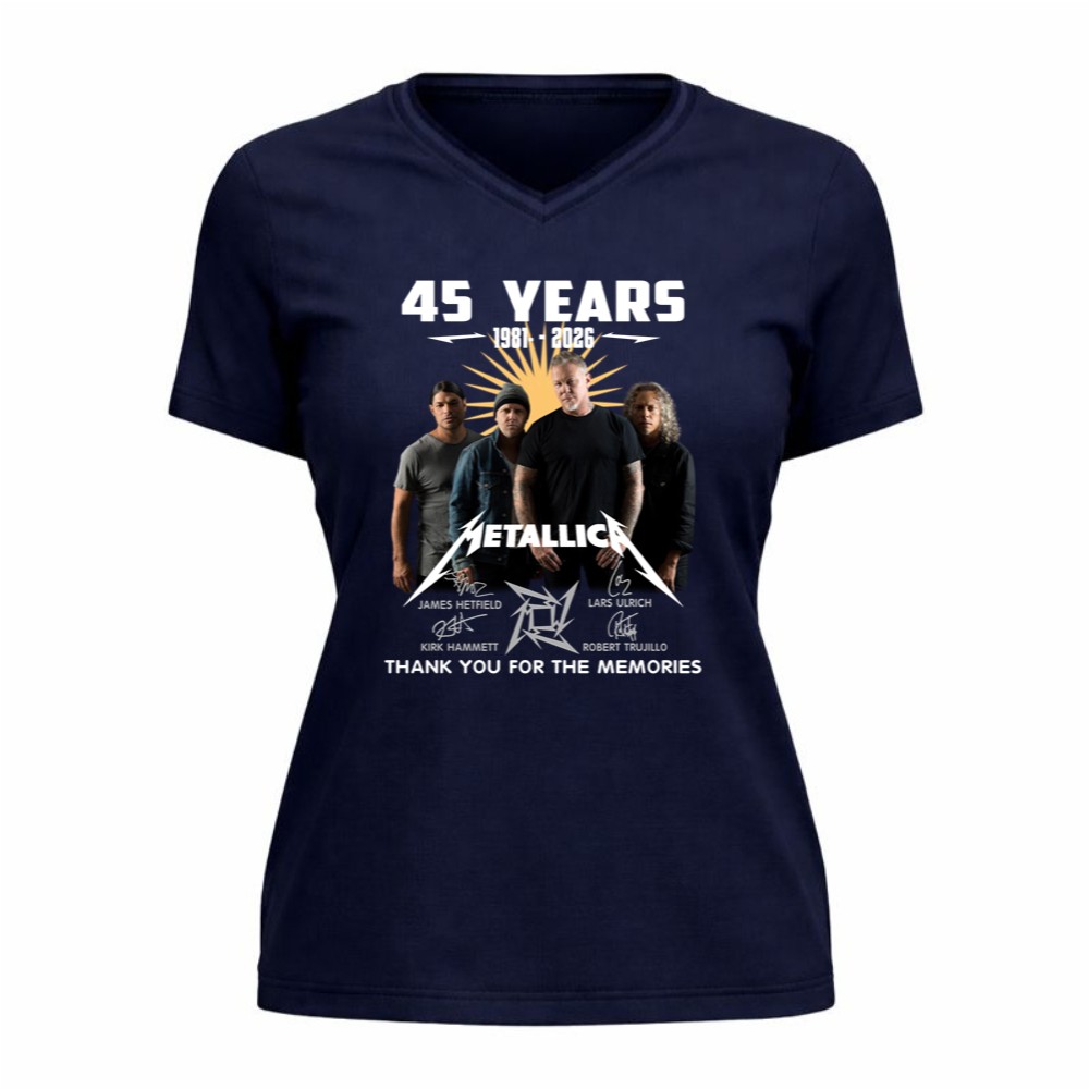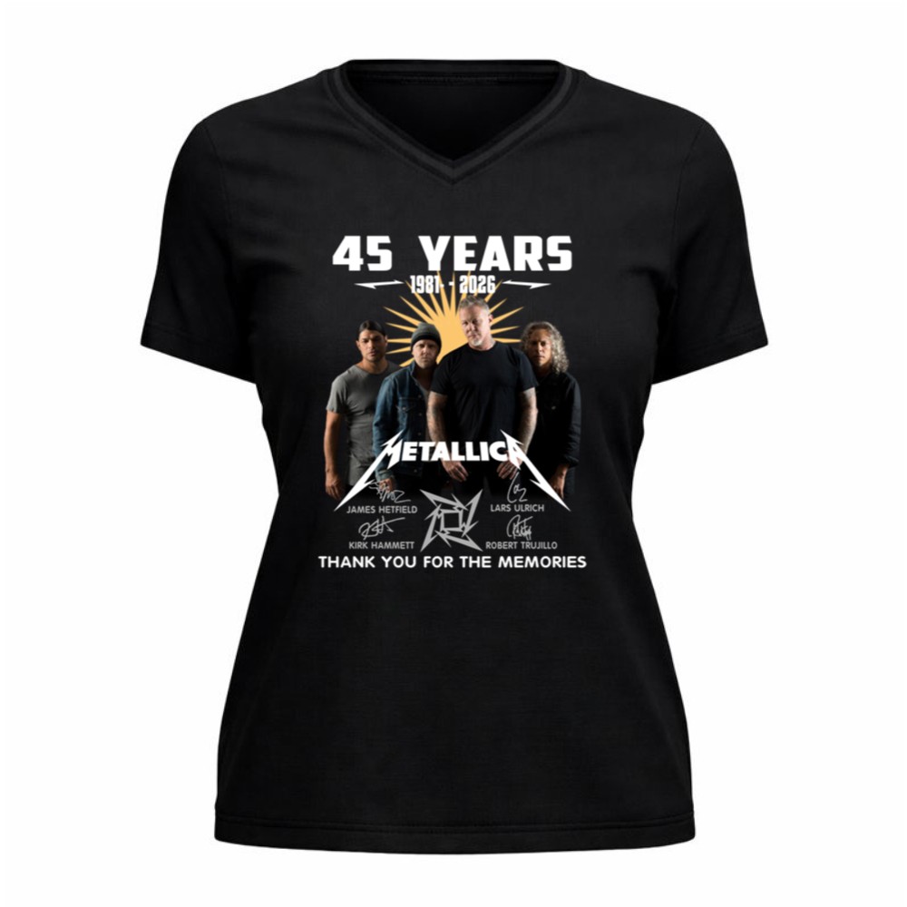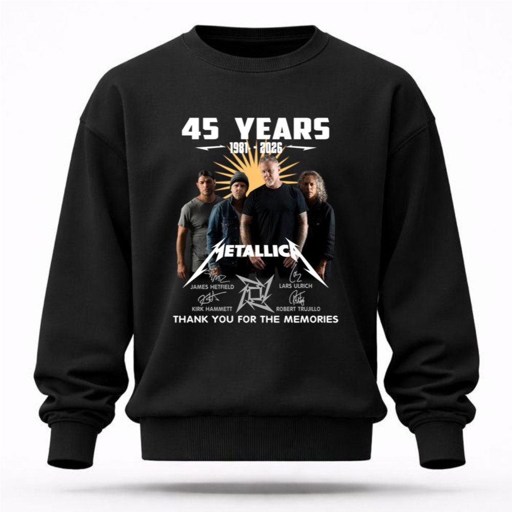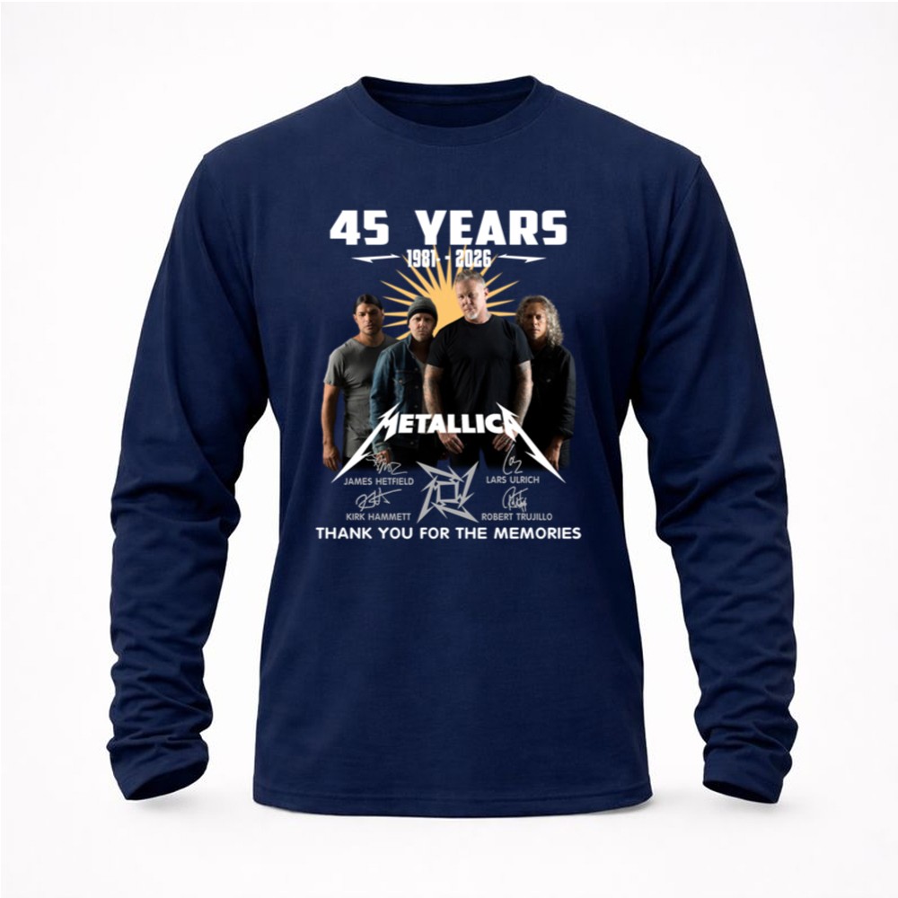 Metallica anniversary shirt, 45 years of metal, rock legends memorabilia, heavy metal music apparel, iconic band signatures, tribute to Metallica, concert-ready t-shirt, thank you for the memories