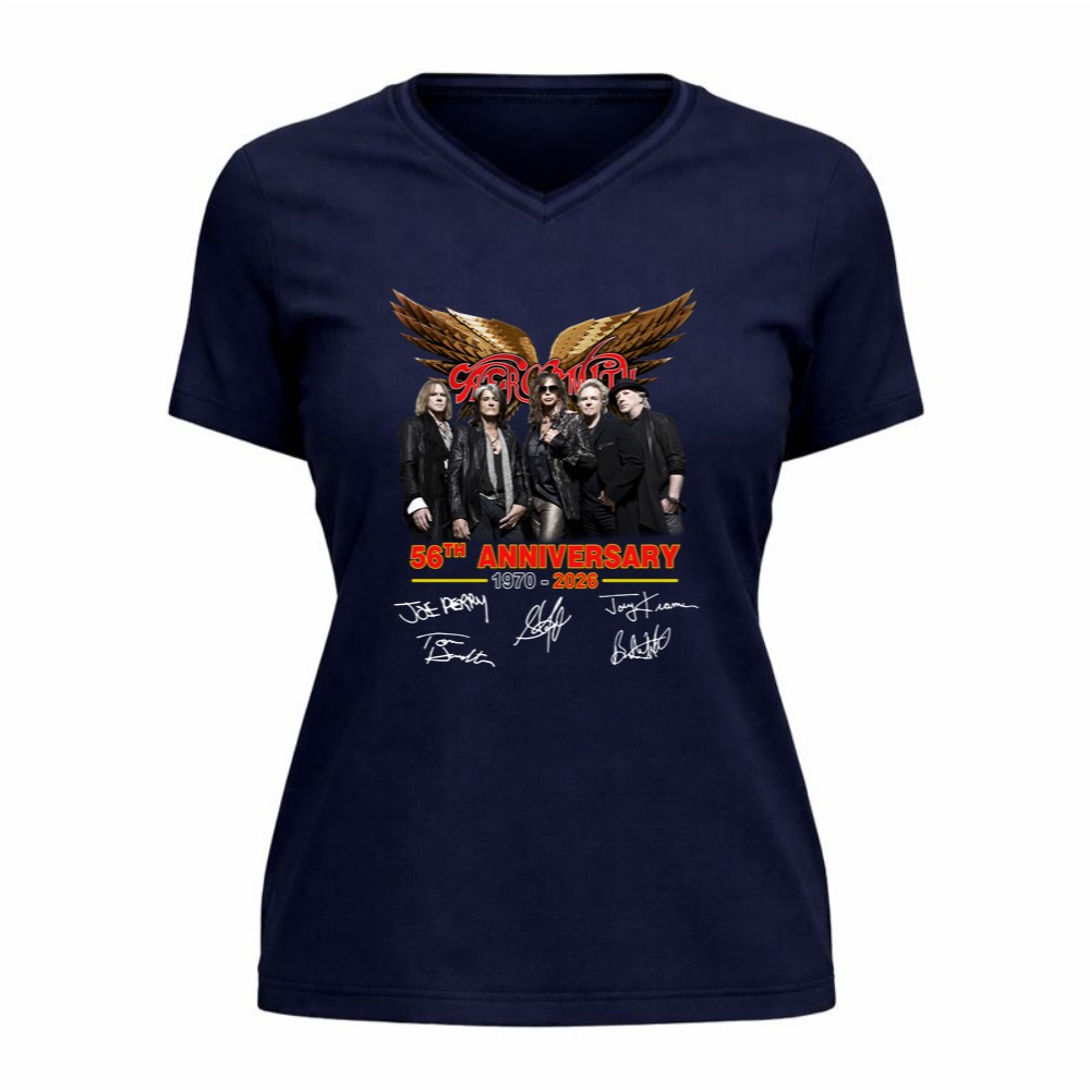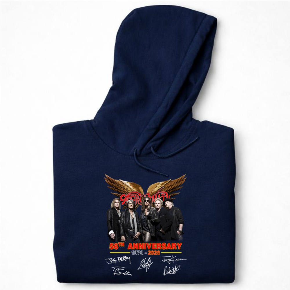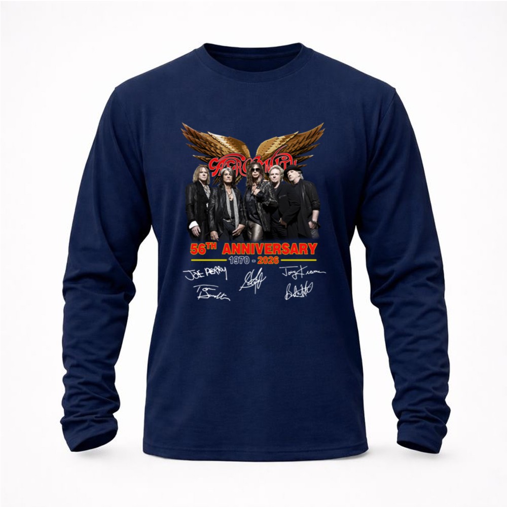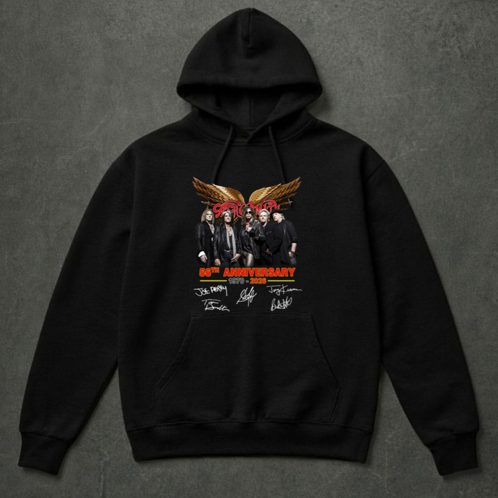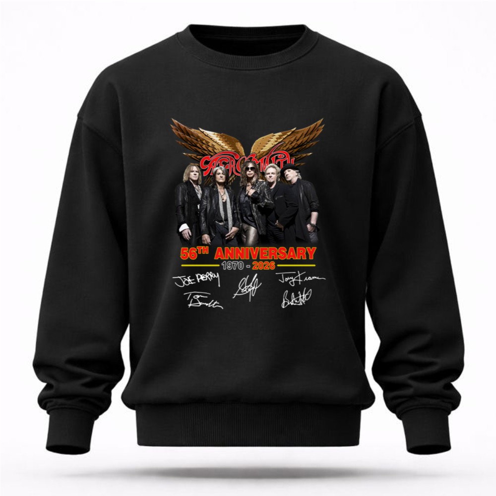 This design pays homage to Aerosmith’s monumental 56-year journey, capturing their essence through bold, vintage graphics. The signatures of Joe Perry, Tom Hamilton, Steven Tyler, Joey Kramer, and Brad Whitford serve as a testament to their enduring legacy. Wearing this tribute is not just about fashion; it’s a heartfelt celebration of a band that has brought joy and connection to music lovers for decades.