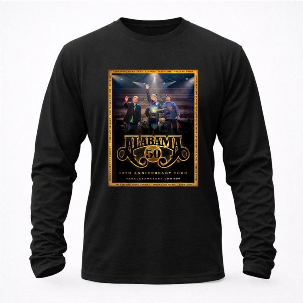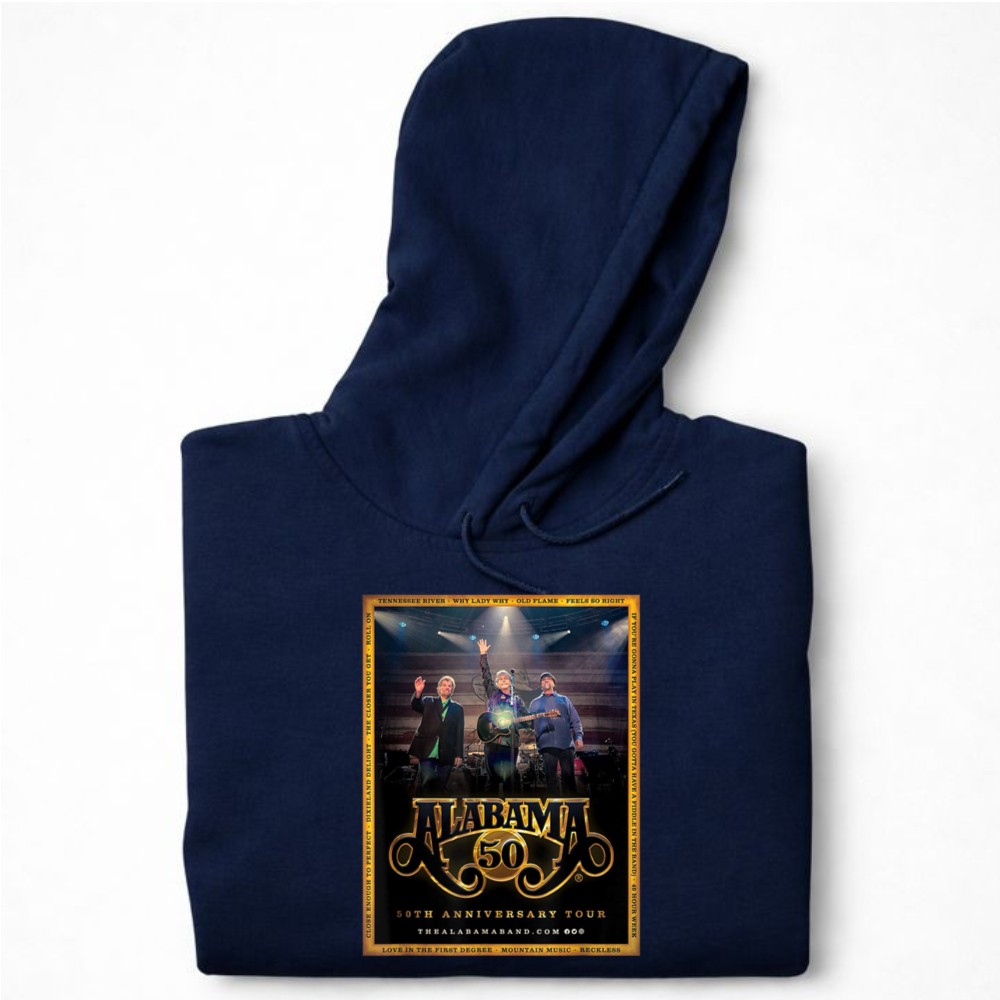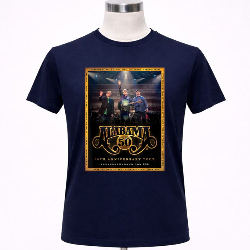 This design pays homage to the rich legacy of the Alabama band, encapsulating the essence of their 50th Anniversary Tour. With bold graphics reminiscent of vintage concert posters, it celebrates not just the music, but the shared experiences and Southern pride that have connected fans over the decades. Wearing this t-shirt means carrying a piece of country music history wherever you go.