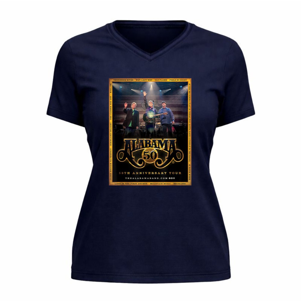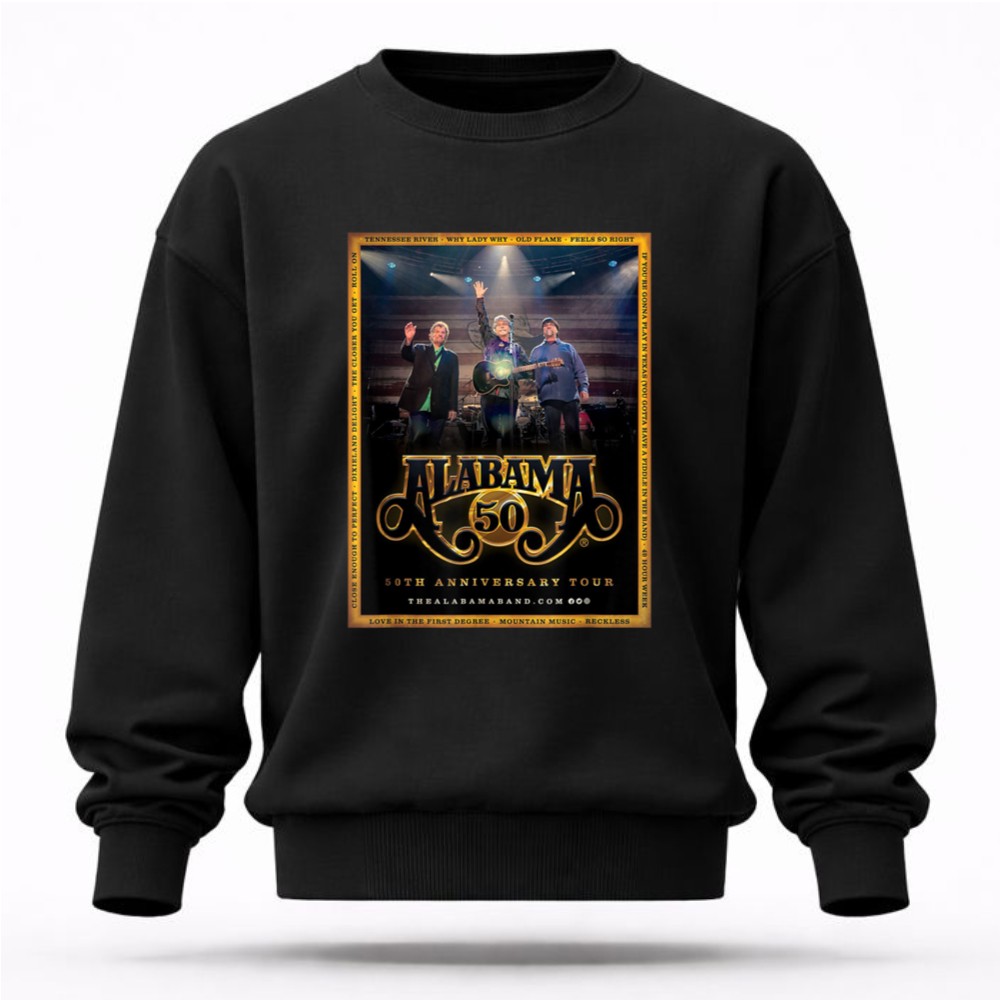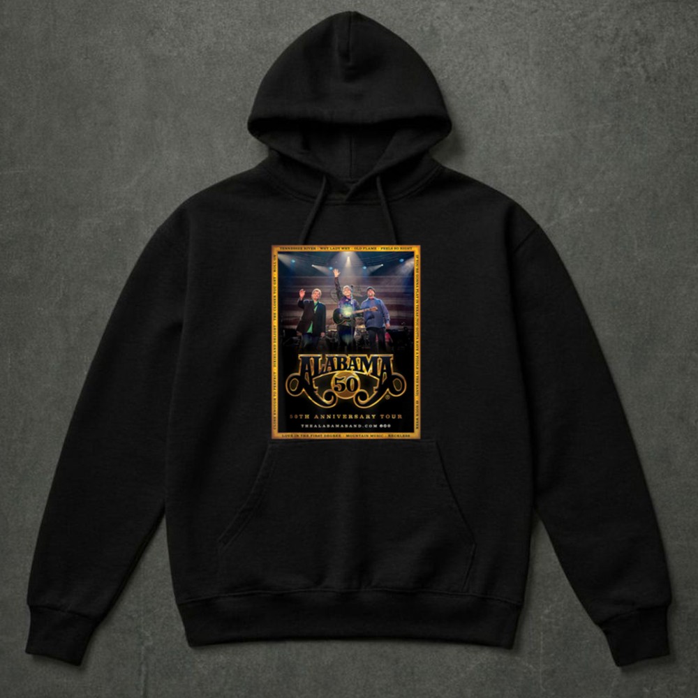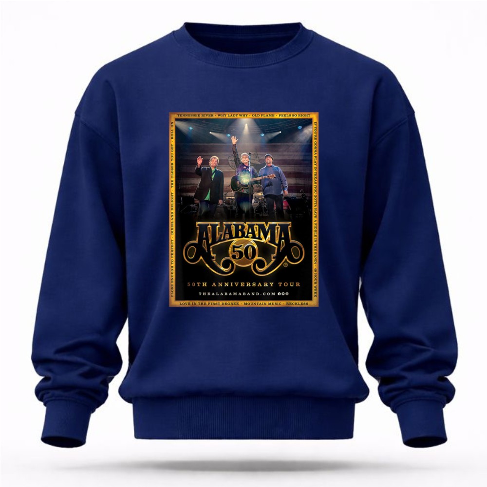 This design pays homage to the rich legacy of the Alabama band, encapsulating the essence of their 50th Anniversary Tour. With bold graphics reminiscent of vintage concert posters, it celebrates not just the music, but the shared experiences and Southern pride that have connected fans over the decades. Wearing this t-shirt means carrying a piece of country music history wherever you go.