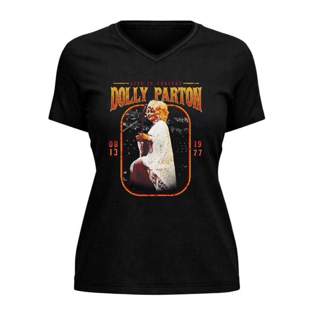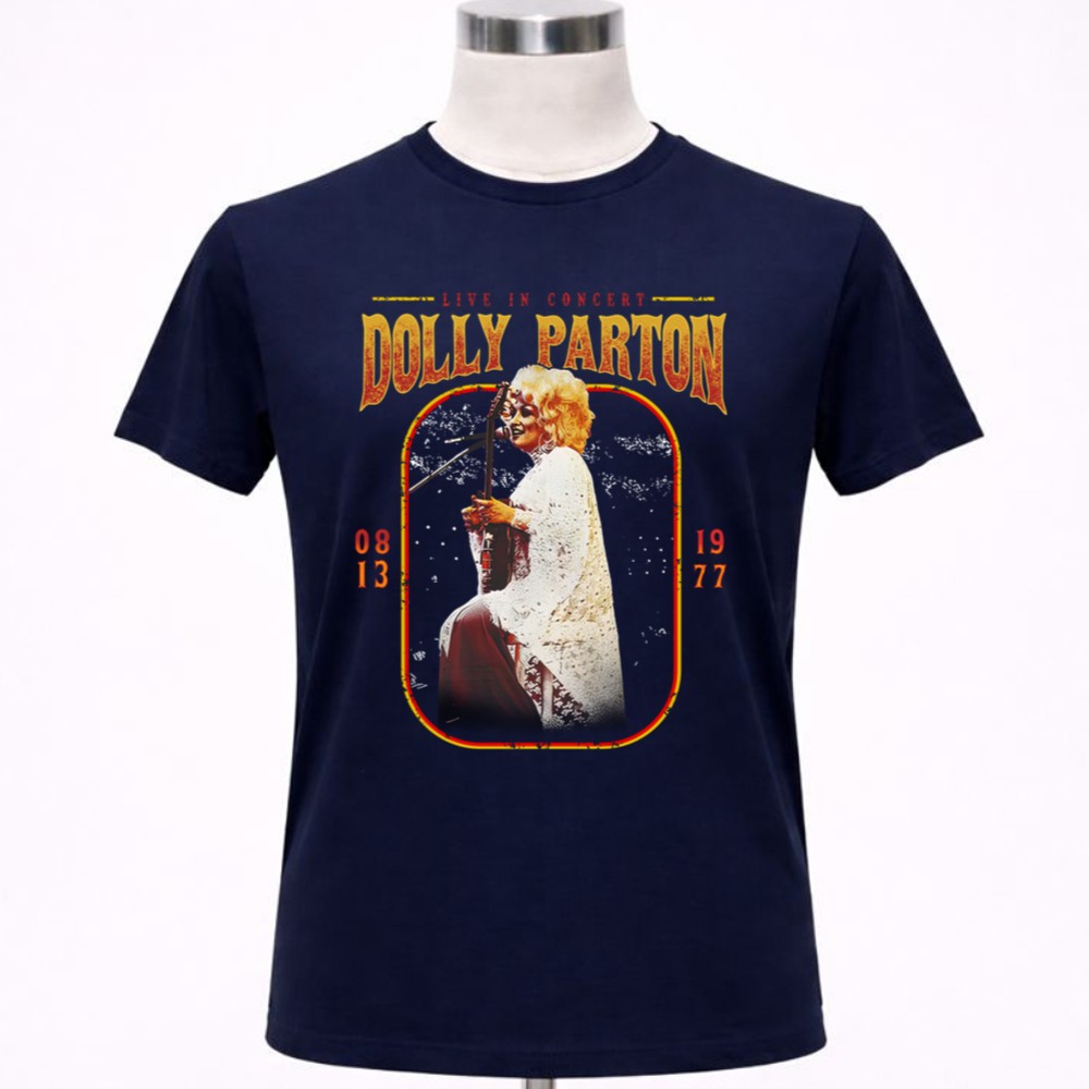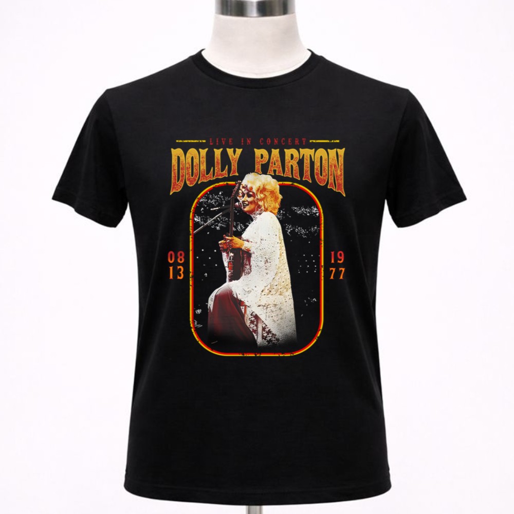 Dolly Parton concert tee, 1977 live performance, country music legend, vintage music apparel, Nashville icon, classic concert memorabilia, music festival wear, timeless artist tribute