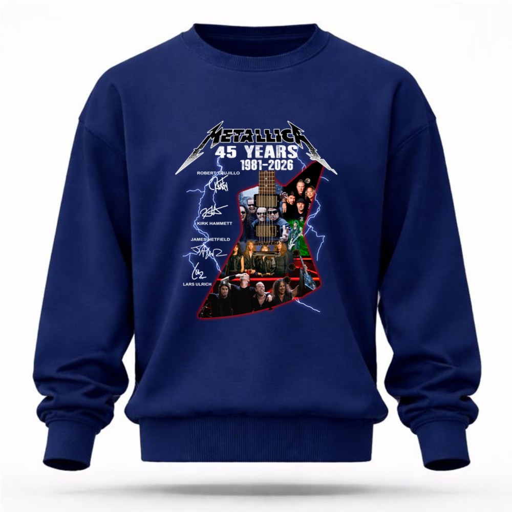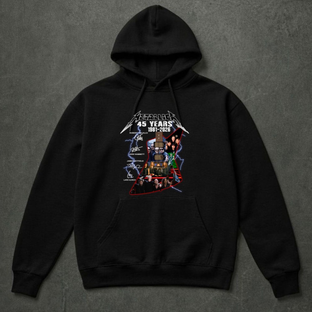 Metallica 45th anniversary, heavy metal legends, rock music icons, concert memorabilia, music fan gift, iconic band signatures, premium quality t-shirt, fans of classic rock