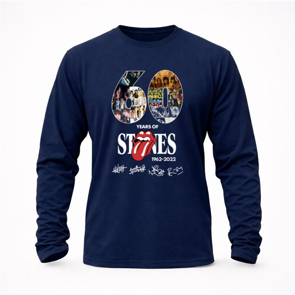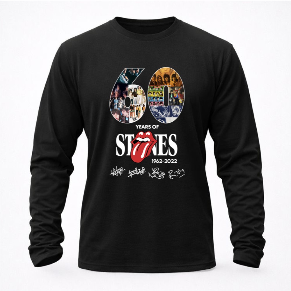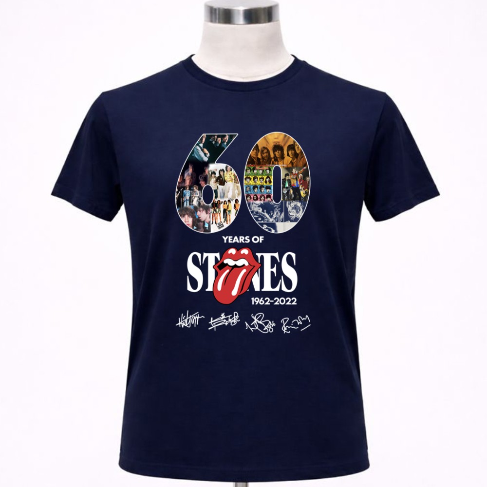 Rolling Stones 60th anniversary, Rock and Roll icons, legendary music moments, iconic band signatures, celebration of music history, gift for music lovers, premium cotton t-shirt, vintage rock memorabilia