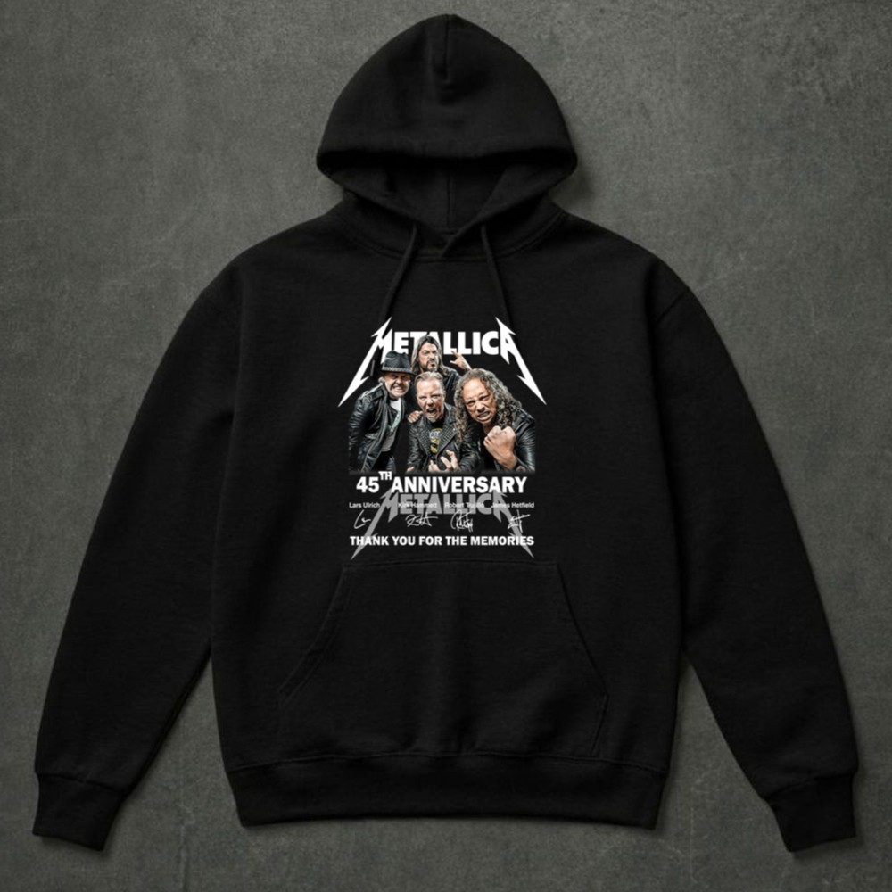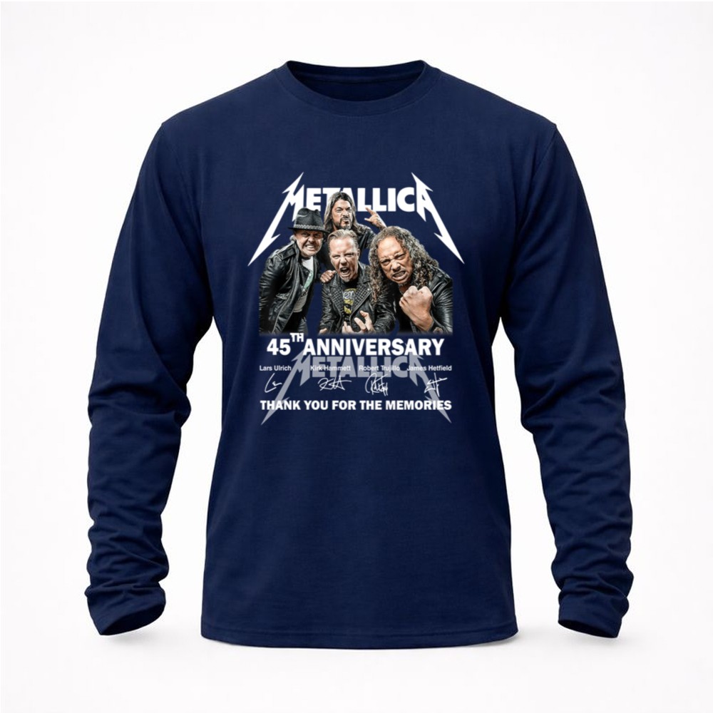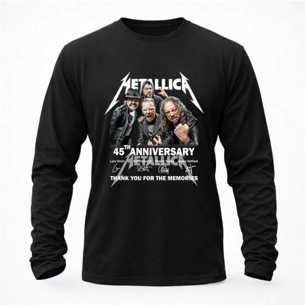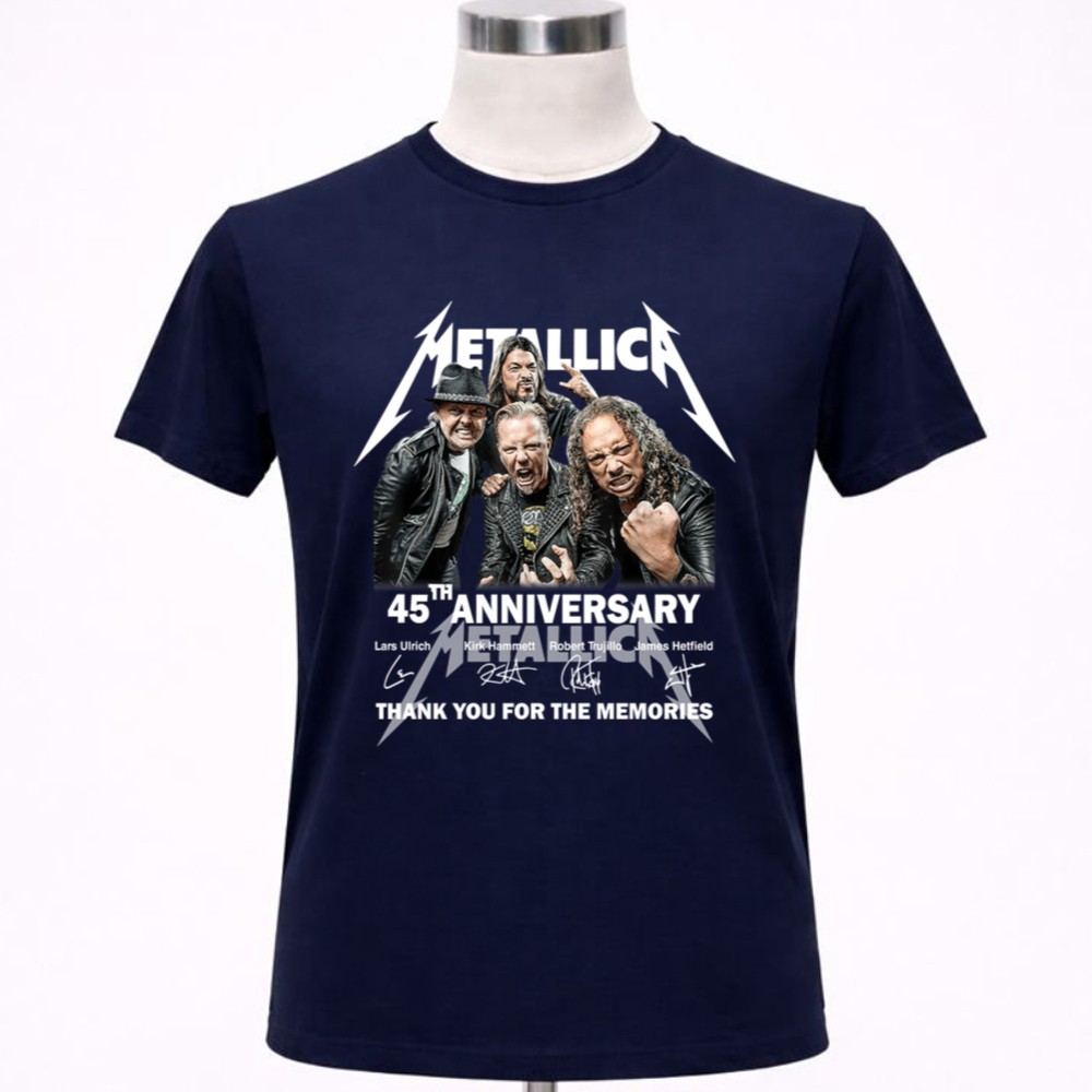 Metallica 45th anniversary, rock music icons, heavy metal legends, band memorabilia, iconic rock t-shirt, tribute to Metallica, thank you for the memories, premium cotton tee