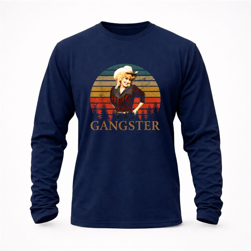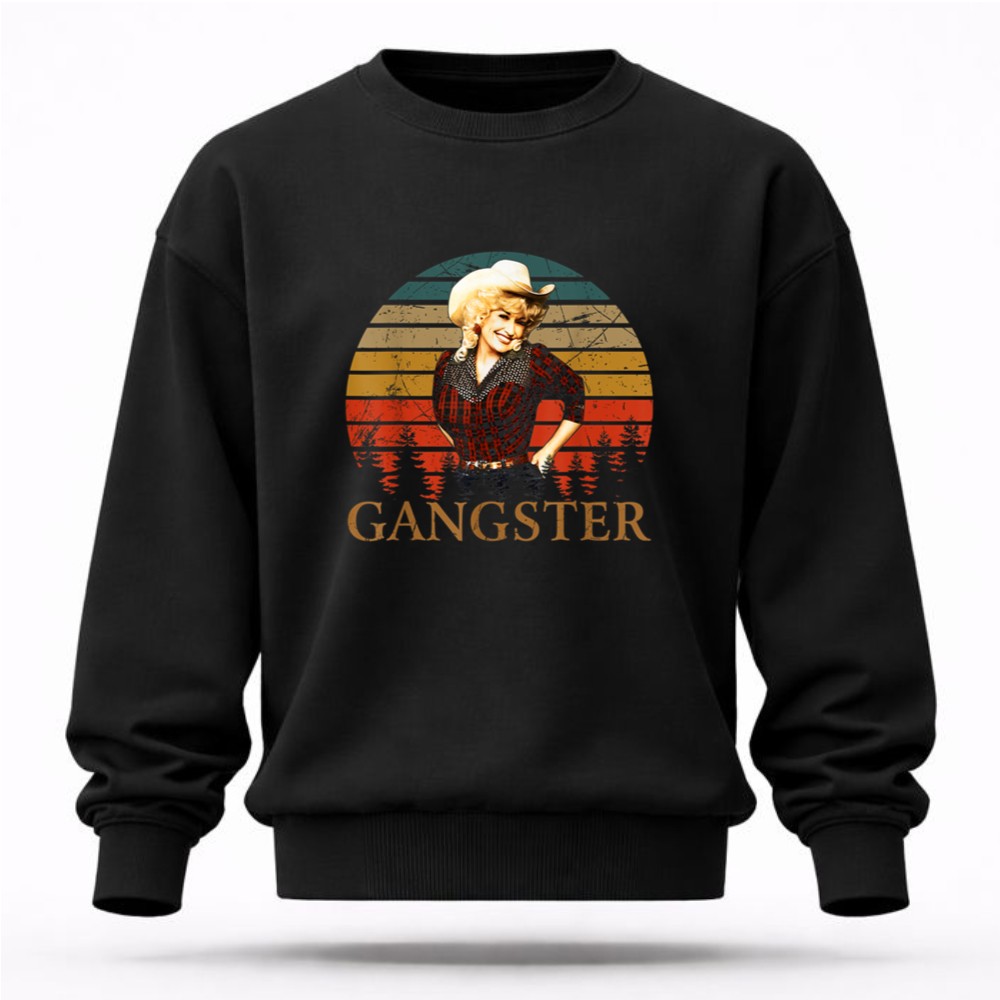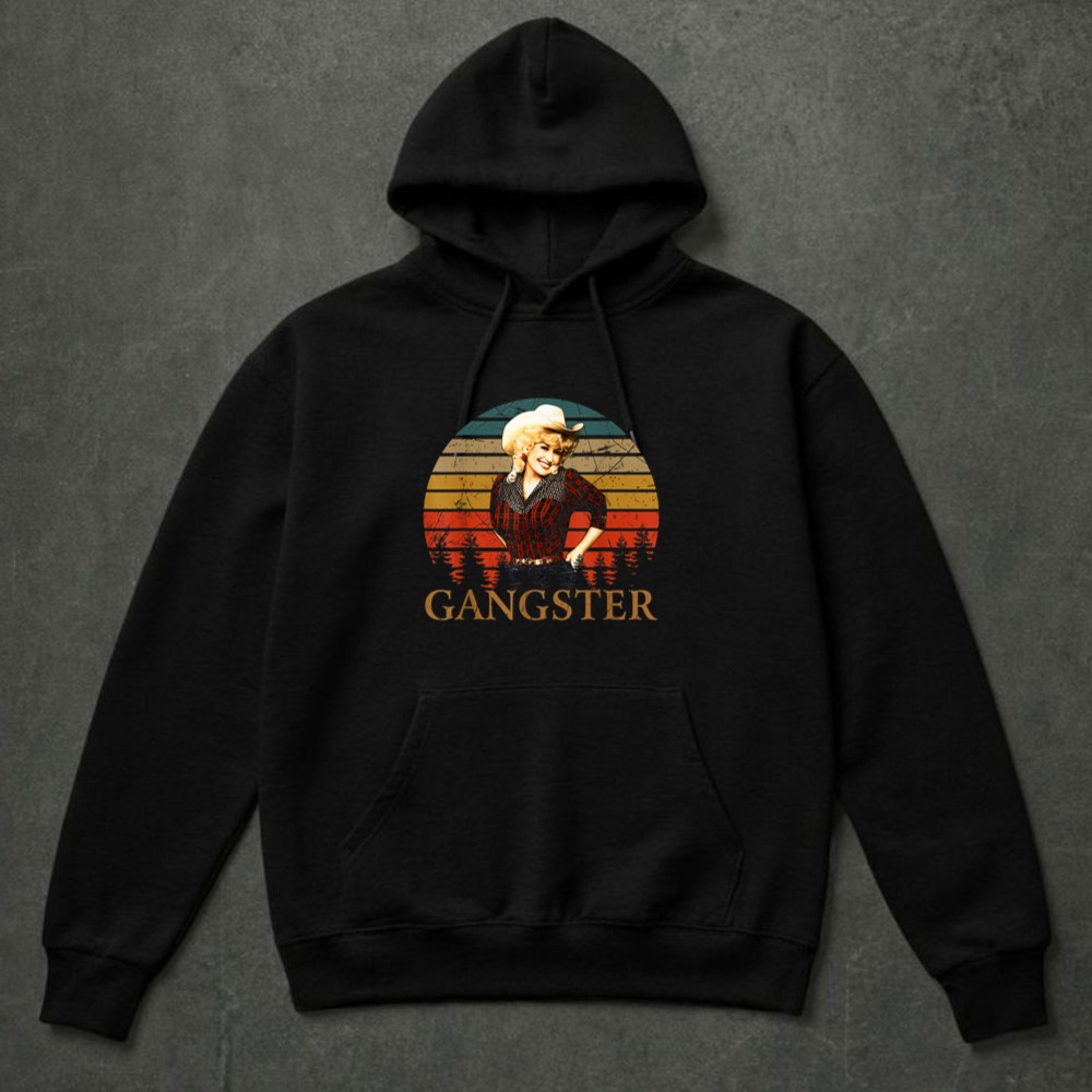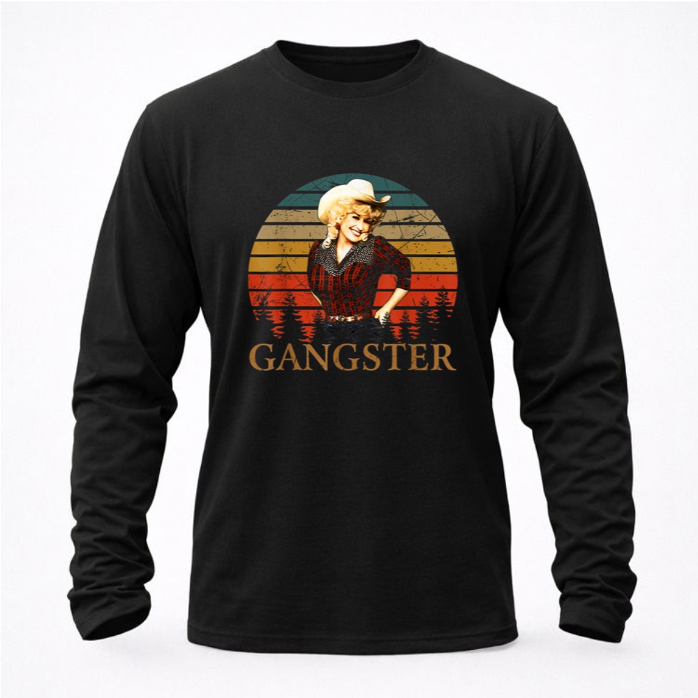 This design pays homage to Dolly Parton, a true country music legend, by blending retro vintage aesthetics with a playful attitude. The bold ‘GANGSTER’ typography beneath her image reflects the empowerment and confidence she embodies, making it a celebration of Nashville pride and pop culture. The warm sunset background adds a touch of southern charm, inviting admirers to connect with the spirit of fun and authenticity.